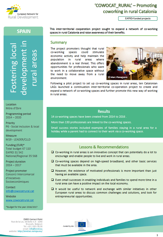 The European Network for Rural Development (ENRD), doncs, destaca la voluntat del projecte Cowocat_Rural d'estimular l'activitat econòmica i de manteniment de la població a les zones rurals a través de la vertebració d'una xarxa d'espais de coworking.